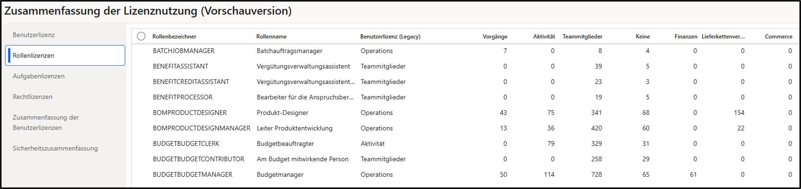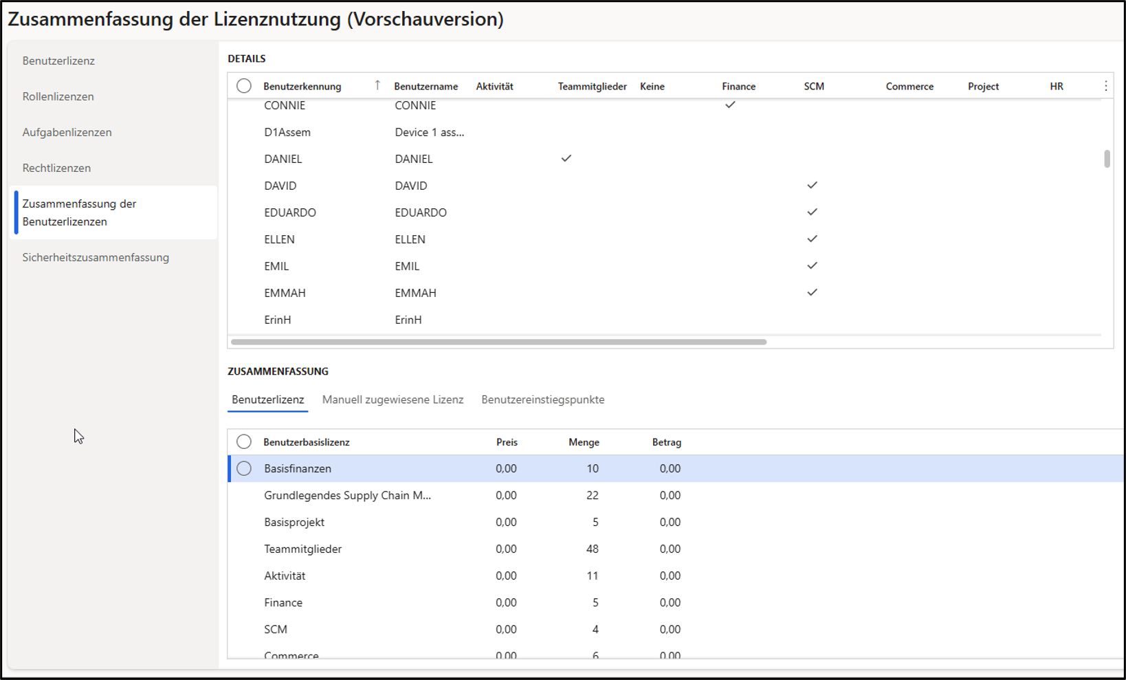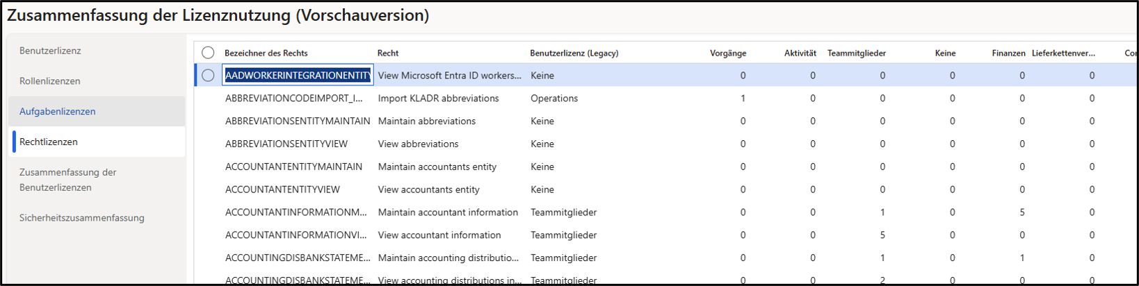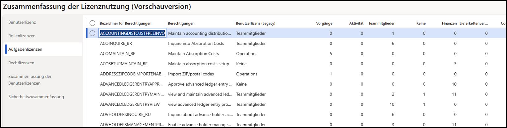 Bisher lieferten die Lizenzberichte in Dynamics 365 Finance und SCM lediglich eine grobe Orientierung, welcher User welche Lizenzen benötigte. Mit dem Wechsel auf die neuen Lizenzbestimmungen hat Microsoft auch einen neuen Report für die Rollenauswertung und die daraus resultierende Berechnung des Lizenzbedarfs zur Verfügung gestellt (noch im Preview, es muss dazu das Feature „User security governance license usage summary report“ aktiviert werden). Dieser ist ab Version 10.0.43 unter „Systemeinstellungen -> Sicherheit -> Sicherheitsgovernance -> Zusammenfassung der Lizenznutzung“ zu finden.