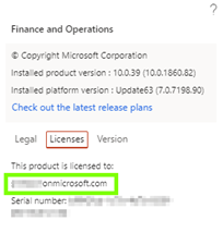 • Microsoft Entra ID tenant: Geben Sie Ihren Entra ID tenant an. Ihren Tenant finden Sie z. B. in D365FSCM unter Help&Support > About > Licenses.