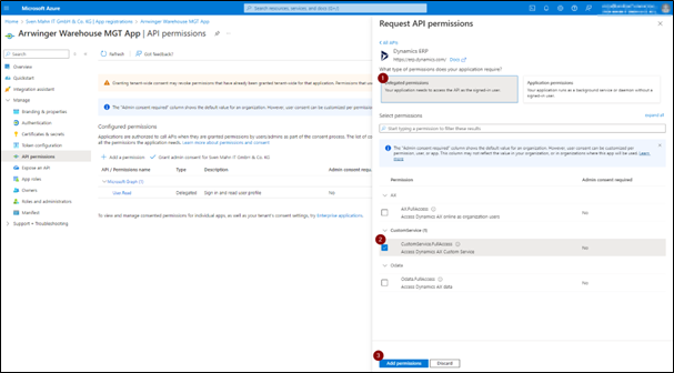 10. Im neuen Fenster wählen Sie die Delegierte Berechtigungen (1) aus und aktivieren Sie unter Custom Service das Kästchen CustomService.FullAccess (2). Abschließend klicken Sie auf Berechtigung hinzufügen (3), um die Änderung zu speichern.