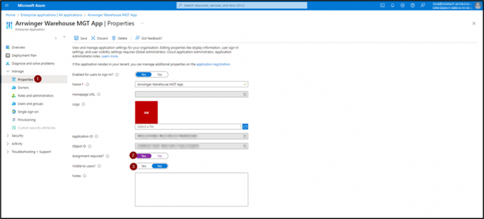 11. Kehren Sie zur Hauptseite Azure-Portal zurück und wählen Sie Microsoft Entra ID > Enterpreise applications und suchen Sie nach Ihrer neuen Anwendung. Aus dem linken Menü wählen Sie unter Verwaltung die Option Eigenschaften (1) aus und legen Sie die folgenden Werte fest und speichern Sie sie: