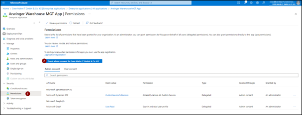 13. Anschießend wählen Sie aus dem linken Menü unter Sicherheit die Option Berechtigungen (1) aus und erteilen Sie die Administrationseinwilligung (2).
