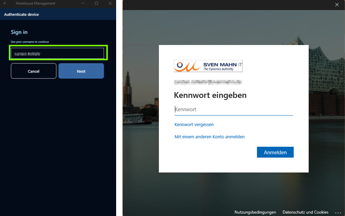 App erzeugt Gerätecode, welcher durch einen Admin zusammen mit Benutzername und Passwort eines Entra-ID-Kontos in einem Onlineformular eingegeben werden muss. Zur Authentifizierung wird eine gerätespezifische Entra-ID verwendet (man kann auch ein und dieselbe für alle Geräte verwenden). Der Lagermitarbeiter meldet sich dann wie gewohnt mit UserID und Passwort des Lagerarbeiters an (Warehouse worker). Das persönliche Entra-ID – Konto des Mitarbeiters wird zur Anmeldung am Gerät verwendet. Durch Verknüpfung des Users (EntraID) mit einem Mitarbeiter (HCMWorker & Warehouse worker) reicht dies für die Anmeldung.