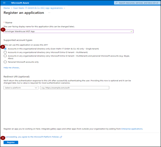 2. Im Azure-Portal wählen Sie Microsoft Entra ID > App-Registration > New Registration.