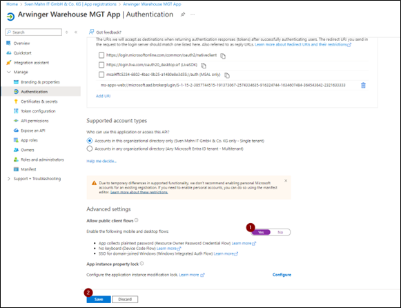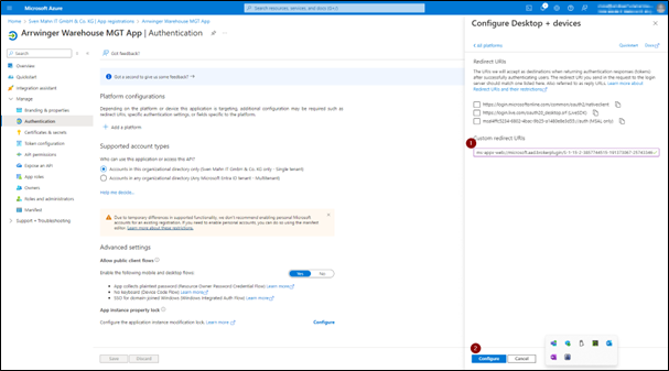 6. Im Dialogfeld Desktop + Geräte konfigurieren setzen Sie das Feld Benutzerdefinierte Umleitungs-URIs auf den folgenden Wert: ms-appx-web://microsoft.aad.brokerplugin/S-1-15-2-3857744515-191373067-2574334635-916324744-1634607484-364543842-2321633333