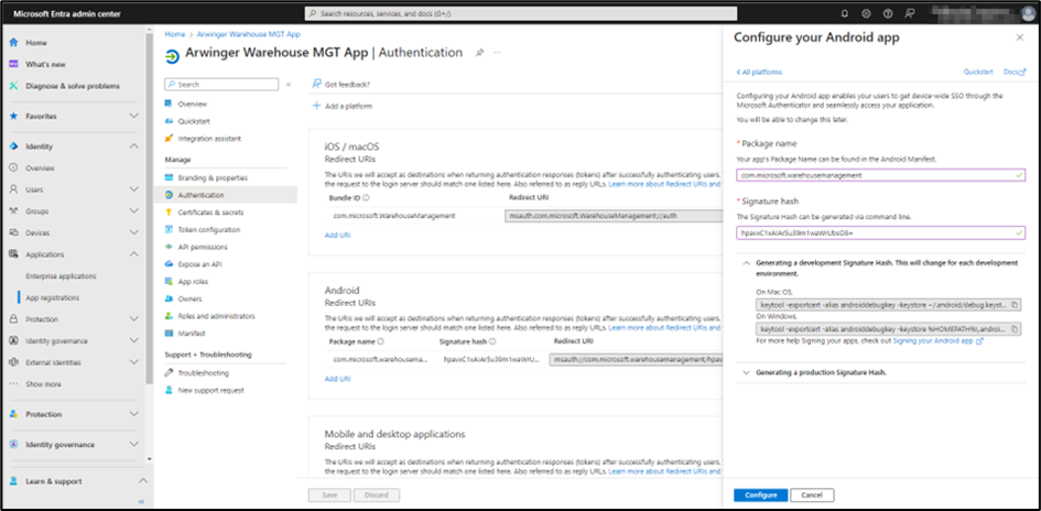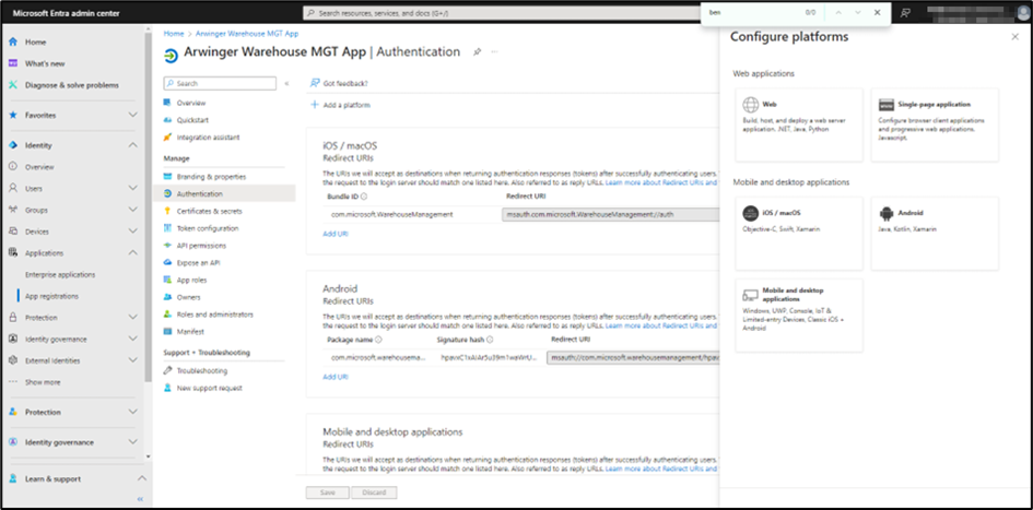 8. Optional: Wenn Sie IOS-Geräte verwenden, sollten Sie erneut die Option Plattform hinzufügen und iOS / Mac OS auswählen und Folgendes in das Feld eingeben: microsoft.WarehouseManagement.