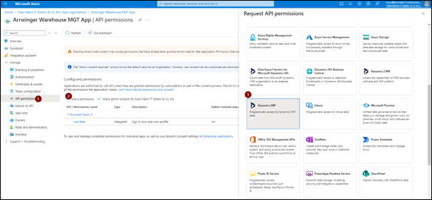9. Nachdem Sie das Plattform hinzugefügt haben, klicken Sie im linken Menü unter Verwaltung auf API-Berechtigungen (1). Wählen Sie Berechtigung hinzufügen (2) und dann auf der Unterseite Dynamics ERP (3) aus.